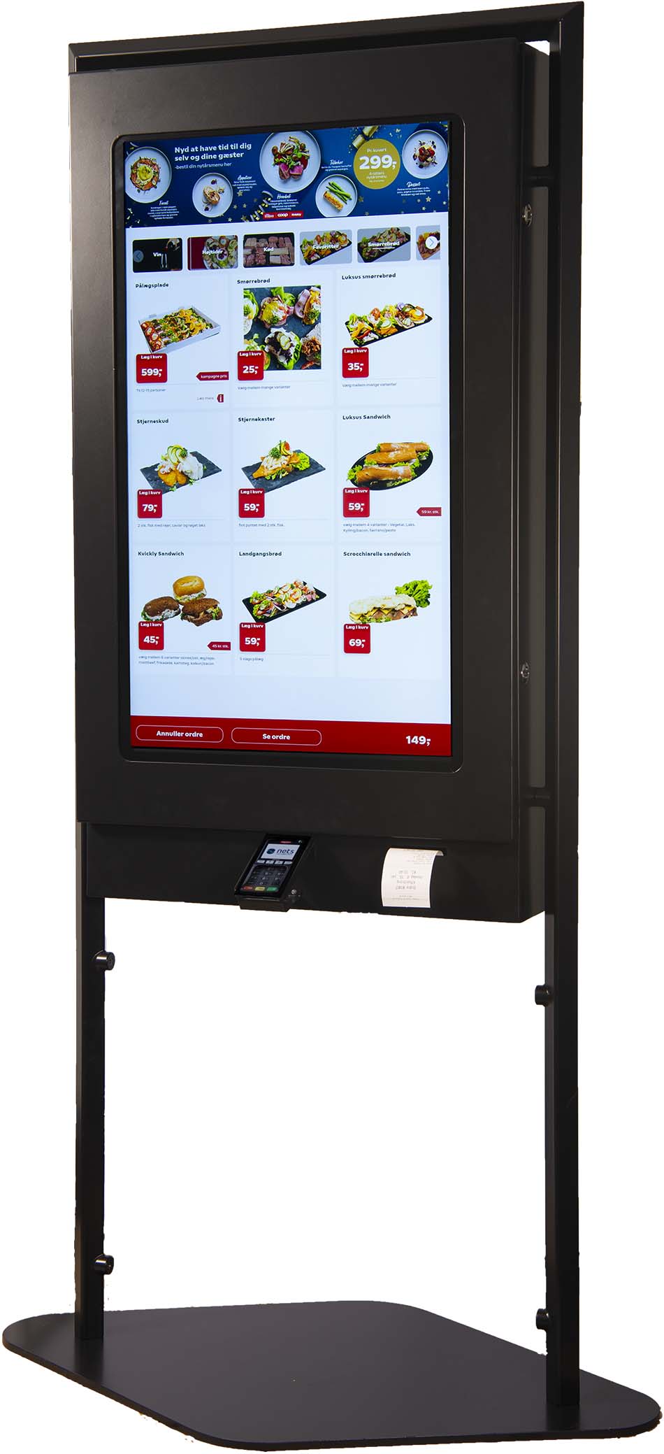 Med en bestillingsskærm får du en tro kopi af jeres online bestillingsside med alle de samme produkter som ses på jeres hjemmeside. Hvis kunderne ønsker at bestille på skærmen, foregår det på samme måde som hvis de besøgte hjemmesiden, bare nede i butikken.
